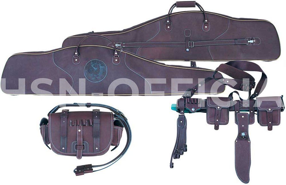 Набор изготовлен из натуральной кожи. Чехол изнутри проклеен поролоном и обшит тканью автовелюр, которая не боится масла и влаги. Предназначен для нарезного оружия длиной до 139 см.